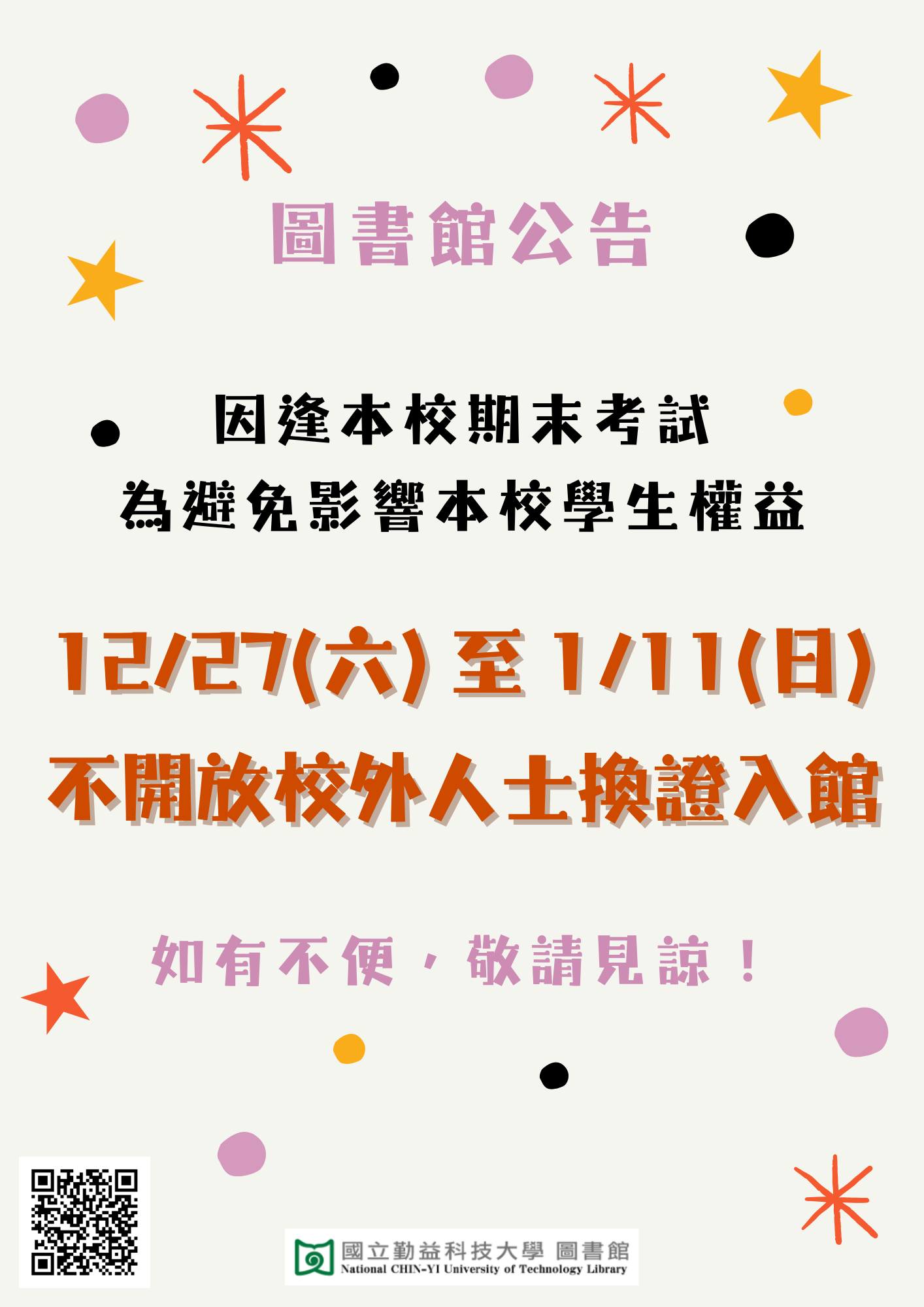 圖書館於12/27(一)~1/11(日)考試期間不開放校外人士換證入館