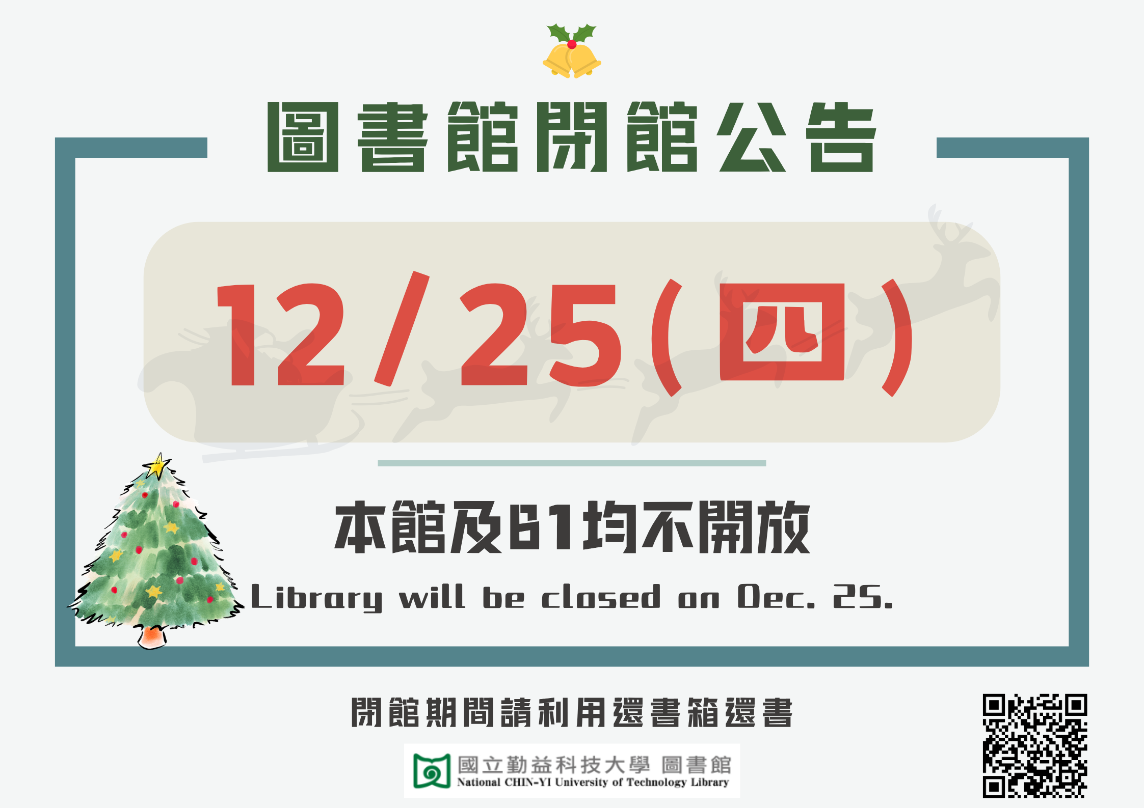 圖書館閉館日公告:12/25,本館及B1均不開放,閉館期間請利用還書箱還書,謝謝。