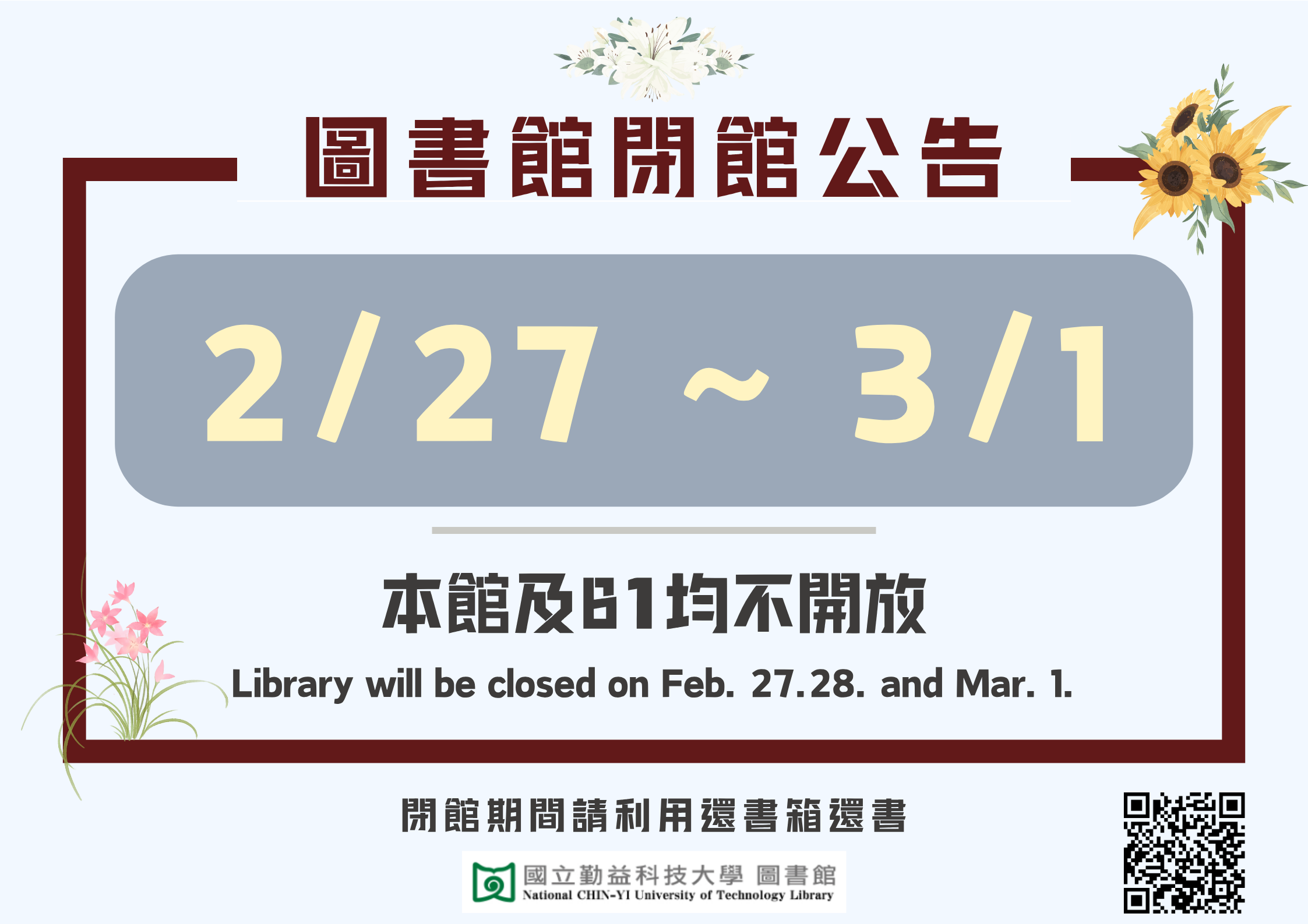 圖書館閉館日公告:2/27~3/1,本館及B1均不開放,閉館期間請利用還書箱還書,謝謝。